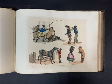 ALKEN, Henry. Symptoms of Being Amused. Londra: Thomas McLean, 1822. Folio oblungo, frontespizio inciso, 35 tavole colorate a mano (su 42). Legatura coeva in mezza pelle, titolo su tassello al piatto e al dorso (piatto staccato). Copia, purtroppo scompleta, di questo classico della satira britannica.