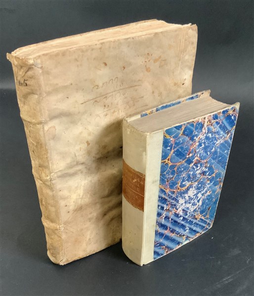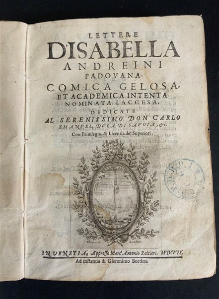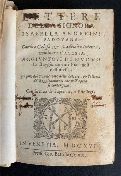 ANDREINI, Isabella. Lettere. Venezia: Marc'Antonio Zaltieri ab instantia di Gieronimo Bordon, 1607. 4to. Con un bel ritratto in ovale di Isabella Andreini inciso in rame da Sadeler e datato in lastra 1602. Impresa de l'Accesa incisa in rame da Thomas de Leu al frontespizio, capilettera e fregi xilografici (gora d'acqua e piccoli forellini di tarlo nell'angolo inferiore interno di parte del volume, poche carte brunite e una macchia di inchiostro a una pagina ma bella copia). Legatura coeva in pergamena floscia, con segni del tempo. Provenienza: timbro di collezione privata al frontespizio, alcune note di possesso manoscritte ai contropiatti. Completo. SI AGGIUNGE della stessa autrice: Li Ragionamenti piacevoli. Venezia: 1617. Non collazionato e difetti da esaminare.