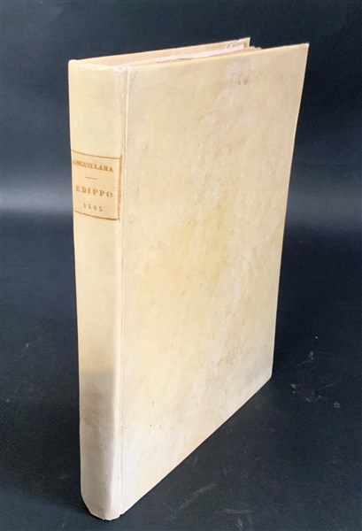 ANGUILLARA, Giovanni Andrea. Edippo tragedia. Padova: Lorenzo Pasquatto, 1565. 4to. Marca dello stampatore al frontespizio e capilettera figurati incisi in legno (frontespizio con un'ampia lacuna reintegrata e forellini di tarlo anche restaurati, altri forellini riparati alle due carte successive e all'ultima con l'Errata, taglio riparato a carta 13, fioriture e aloni marginali sparsi). Legatura moderna in piena pergamena.