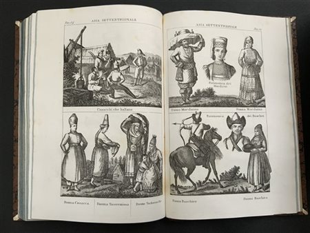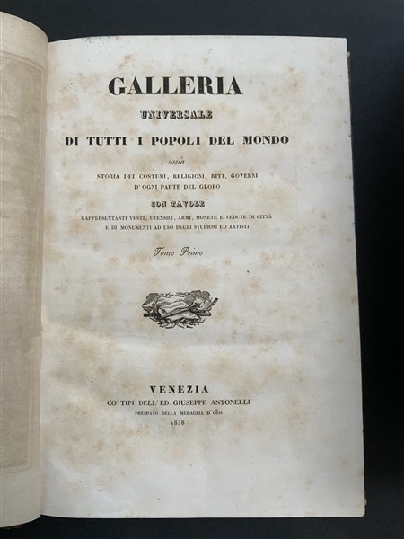 [ANTONELLI, Giuseppe]. Galleria universale di tutti i popoli del mondo ossia storia dei costumi, religioni, riti, governi d'ogni parte del globo. Venezia: Antonelli, 1838-47. 5 tomi in 4 volumi, numerosissime tavole in ottimo stato di conservazione. Dorsi in pelle coeva decorati in oro, piatti in cartone marmorizzato e tagli a spruzzo blu. Il primo volume è dedicato all'Asia, il secondo all'Africa, il terzo alle America e il quarto (diviso in due tomi) all'Europa. Non collazionato e difetti da esaminare. [5]