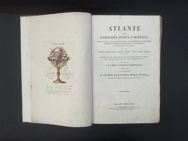 BARBIELLINI, Carlo Antonio. Atlante della Geografia Antica e Moderna. Milano: C.A. Barbiellini, 1807. Folio, sfera armillare in antiporta, 48 incisioni, la maggior parte colorata a mano (alcuni strappi e perdite). Legatura in mezza pelle (lievi difetti).