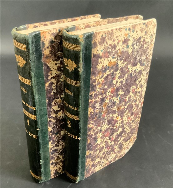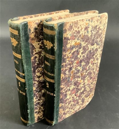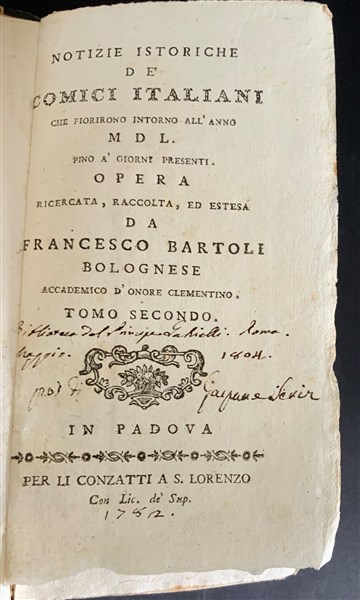 BARTOLI Francesco. Notizie istoriche de' comici italiani che fiorirono intorno all'anno MDL fino a' giorni presenti ...]. Tomo primo (-secondo). Padova: Conzatti, 1782]. 2 volumi in 12mo. Antiporta allegorica incisa in rame nel primo volume, piccoli fregi ai frontespizi, ornamenti tipografici al testo e marca dello stampatore in fine del secondo tomo, il tutto xilografico. Buona copia in mezza pelle verde del XIX secolo, in barbe, piatti marmorizzati, titoli impressi in oro ai dorsi