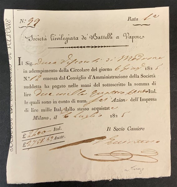 [BATTELLO A VAPORE]. Certificato azionario rilasciato al Duca Visconti di Modrone per la costituzione della Società Privilegiata de Batelli a Vapore il 6 luglio 1825. Si tratta della prima società Italiana di navigazione di battelli a vapore.