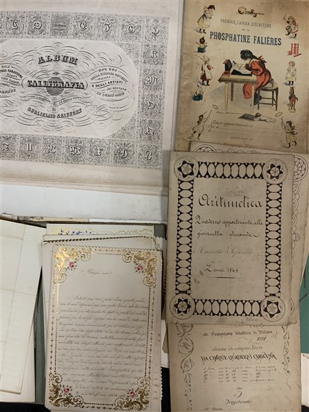 [CALLIGRAFIA]. Curiosa serie di documenti, stampe ed esempi di calligrafia fra cui una serie di diplomi e attestati