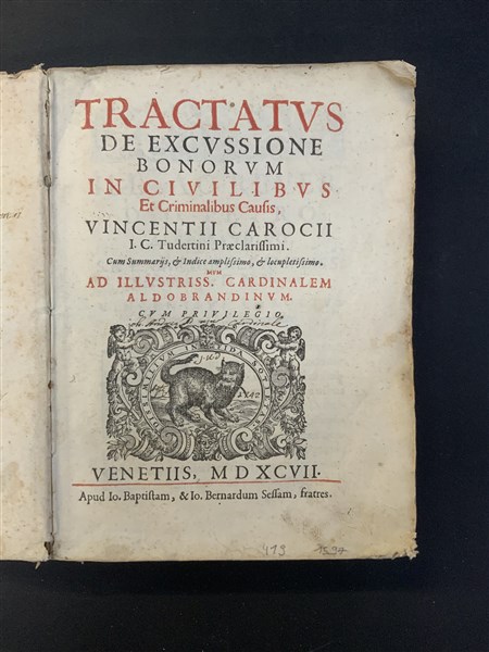 CAROCCI Vincenzo. Tractatus de excussione bonorum in civilbus. Venezia: Sessa, 1597. 4to, frontespizio stampato in rosso e nero, privo di legatura. Non collazionato e difetti da esaminare.