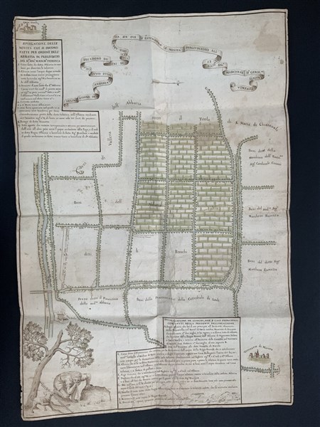 [CARTOGRAFIA] Mappa Catastale (720 x 490mm) Acquarello su carta. Dettagliata mappa catastale disegnata e acquarellata dell'Abbatia sotto il titolo di S. Maria di Chiaravelle.