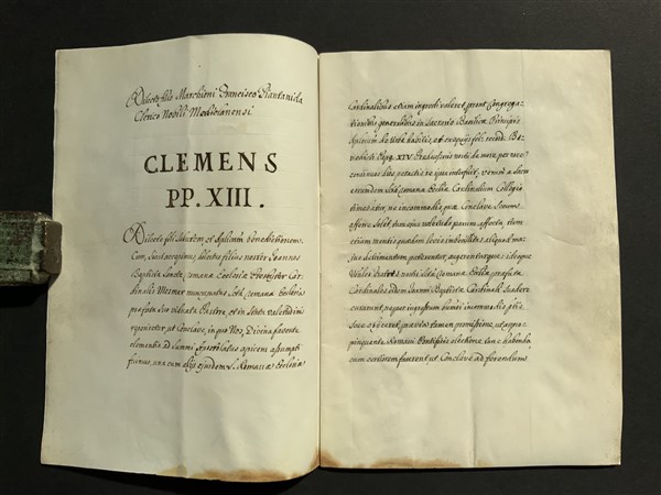 [CLEMENTE XIII] Manoscritto pergamenacea con concessione di ampi privilegi al Marchese Piantanida. 18 Settembre 1758. (265x190 mm) 14 carte, legatura in pergamena