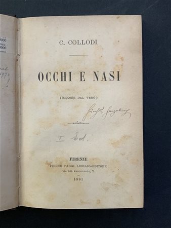 COLLODI Carlo. Occhi e nasi. Firenze: Paggi, 1881. legatura coeva in mezza tela con titolo in oro al dorso. Prima edizione. Non collazionato e difetti da esaminare.