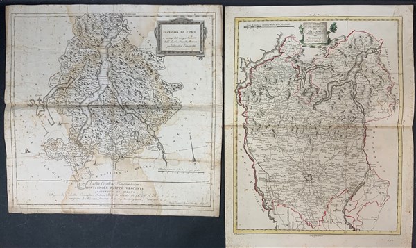 [COMO] FORNARI Mauro, CAGNONI. Provincia di Como a norma del compartimento della Lombardia Austriaca pubblicatosi l'anno 1786. Milano 1789. ( 395x405 mm) segni di piegatura, fioritura, macchia d'acqua al centro. Rara carta geografica raffigurante il territorio della provincia di Como dedicata a Filippo Visconti [CON:] Il ducato proprio di Milano. Venezia: Zatta, 1784 (455x345 mm) coloritura coeva, fioritura marginale