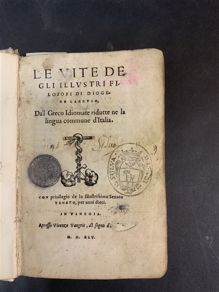 DIOGENE LAERTIO. Le vite degli illustri filosofi. Venezia: Valgrisi, 1545. 8vo,