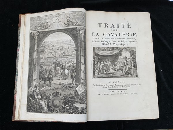 DRUMMOND DE MELFORT, Louis-Hector (1721-1788) - Traité sur La Cavalerie. Parigi: Guillaume Desprez, 1776. Esemplare fresco e marginoso della prima edizione del testo della rinomata opera di ippologia ed equitazione. Folio (454 x 295mm). Occhiello, bella antiporta incisa in rame, grande vignetta al frontespizio, fregi, vignette e iniziali calcografiche e xilografiche, 11 tavole incise in rame (poche lievi macchie). Legatura in mezza pelle con angoli e carta marmorizzata, dorso a 6 nervi con titolo in oro, tagli a spruzzo (mancanze al dorso, piatti staccati). Solo volume di testo, senza il grande volume di tavole