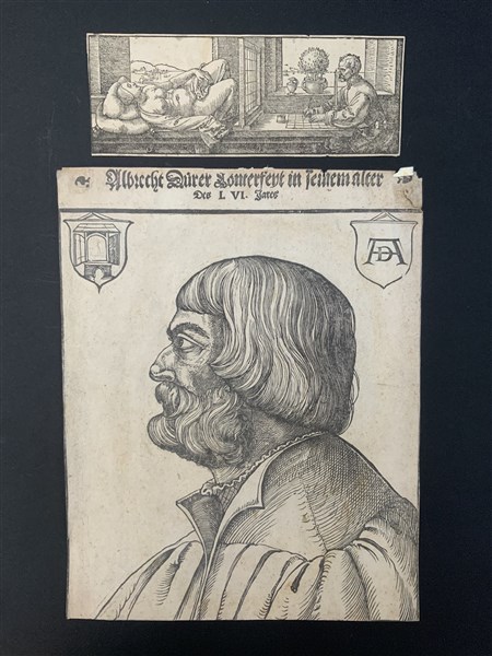 [DURER Albrecht] GEBEL, Matthes. Albrecht Durer Conterfeyt im seinem alter des LVI Jares. Norimberga: Herard Schon c.a 1550] (320 x 250 mm) Bel ritratto di Durer raffigurato a 56 anni SI AGGIUNGE:] DURER Albrecht, Uomo che disegna un nudo femminile 1525-1528. tratta da Unterwisung der Messung