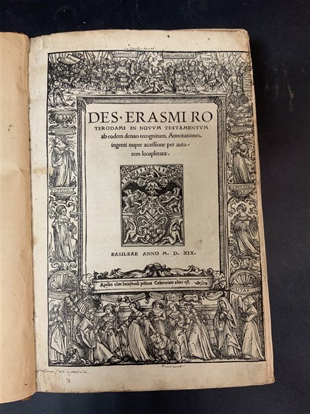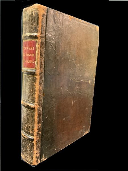 ERASMO DA ROTTERDAM In novum testamentum ab eodem denuo recognitum annotationes. Basilea: Froben, 1519. Folio (290 x 195mm). Frontespizio entro cornice xilografica, capilettera e testatine figurate, 2 cornici xilografiche, vignetta al colophon (rifilato al margine esterno con lieve perdita al frontespizio e alla seconda cornice. Manca B1, B6, D3, D4 ) Legatura degli inizi del XIX secolo con titolo in oro su tassello bordeaux al dorso (qualche difetto)." Prima edizione del commentario al nuovo testamento curato da Erasmo da Rotterdam.