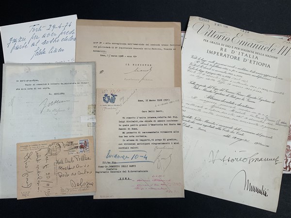 [FASCISMO] Lotto di autografi di personalità fasciste. Si segnala: Mussolini, Rachele Mussolini, Edda Ciano, Dino Grandi, De Stefani e altri