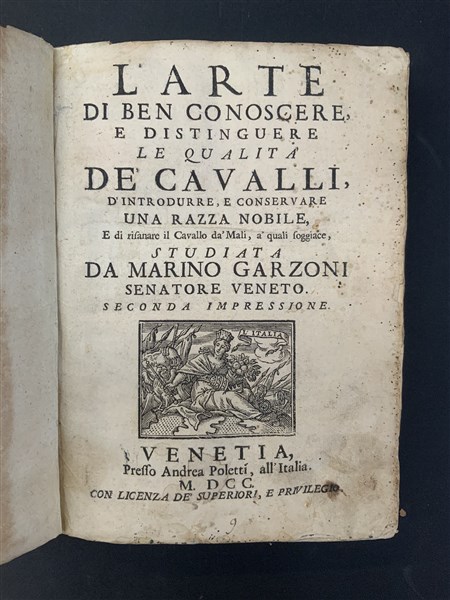 GARZONI, Marino. L'arte di ben conoscere, e distinguere le qualità de' cavalli, d'introdurre e conservare una razza nobile, e di risanare il cavallo da' mali, á quali soggiace. Venezia: Andrea Poletti, 1700. Con 2 (di 3?) tavole incise in rame. Mezza pergamena posteriore (difetti). Non collazionato e difetti da esaminare.