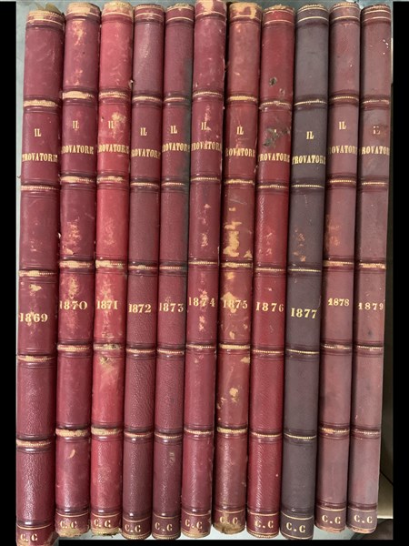 [GIORNALI - IL TROVATORE]. Lotto di 11 volumi de Il trovatore: giornale letterario, artistico, teatrale. I volumi includono tutti gli articoli pubblicati dal 1869 al 1879 rilegati in 4to, con incisioni e titoli in oro su pelle rossa al dorso e piatti in cartone marmorizzato. Il settimanale andò in stampa dal 1854 al 1907 a Milano. Sospeso nel 1908 in seguito alla fusione con la rivista il Palcoscenico, riprese la pubblicazione autonoma dal 1909 fino al 1913. Non collazionato e difetti da esaminare.