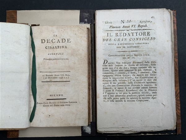 [MILANO - REPUBBLICA CISALPINA] La decade Cisalpina: giornale filosofico-politico-letterario. Milano: Carlo Barrelle, 1798. 8vo, cartone moderno con titolo in oro pelle verde al dorso. INSIEME A: tre numeri (nr. 31-32-33) de Il Redattore del Gran Consiglio della Repubblica Cisalpina una ed indivisibile. Testimonianze interessanti dello spirito politico intellettuale dell'epoca. Non collazionato e difetti da esaminare.