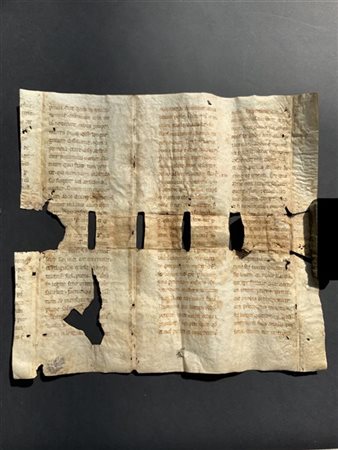 [PAPA GREGORIO MAGNO] Frammento manoscritto su pergamena di riuso XIII-XIV secolo. Carolina cancelleresca (450x405 mm). Frammento delle Homiliae in Evangelia Contenente parti della seconda e quindicesima Omelia.