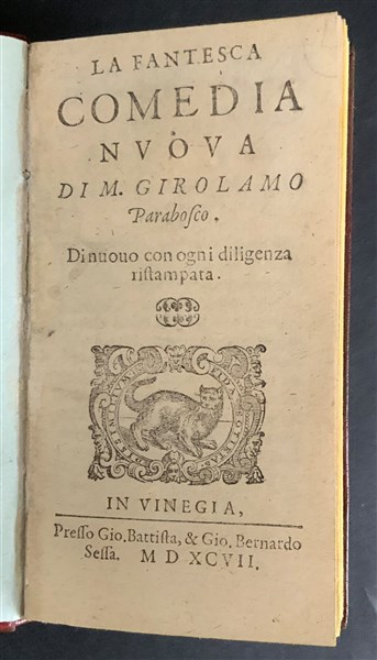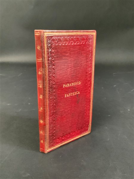 PARABOSCO, Girolamo. La Fantesca comedia nuova ...]. Di nuovo con ogni diligenza stampata. Venezia: Presso Gio. Battista, & Gio. Bernardo Sessa, 1597. 12mo. Marca xilografica dello stampatore al frontespizio (mancanza ab origine nell'angolo inferiore di carta 8 con trascurabile perdita di testo). Marocchino rosso moderno con duplice filetto impresso in oro e roulette a motivi floreali impressa a secco ai piatti, titoli dorati al piatto anteriore. Non collazionato e difetti da esaminare.