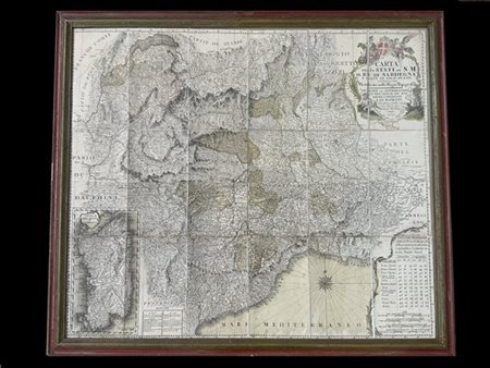 [PIEMONTE] Carta degli stati di S.M il re di Sardegna e parte de paesi ad essi confinanti. Torino: De Caroly, 1779. (715 x 840 mm) entro cornice. Bella carta acquarellata raffigurante i territori piemontesi e limitrofi