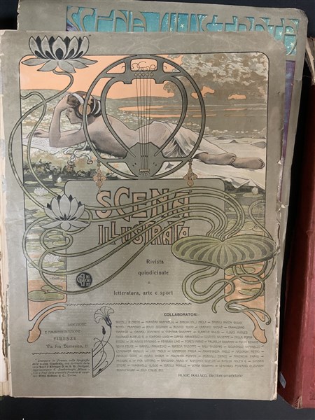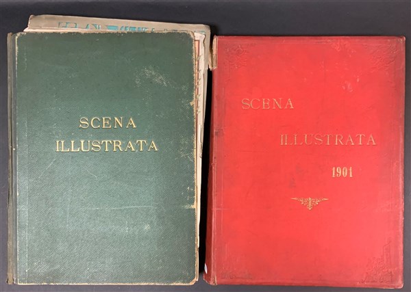 POLLAZZI, Pilade. Scena illustrata. Rivista quindicinale di letteratura, arte e sport. Due volumi contenenti numerosi fascicoli della rivista 1901-1902 Folio tela rispettivamente rossa e verder titolata in oro (alcuni difetti). Non collazionato e difetti da esaminare.