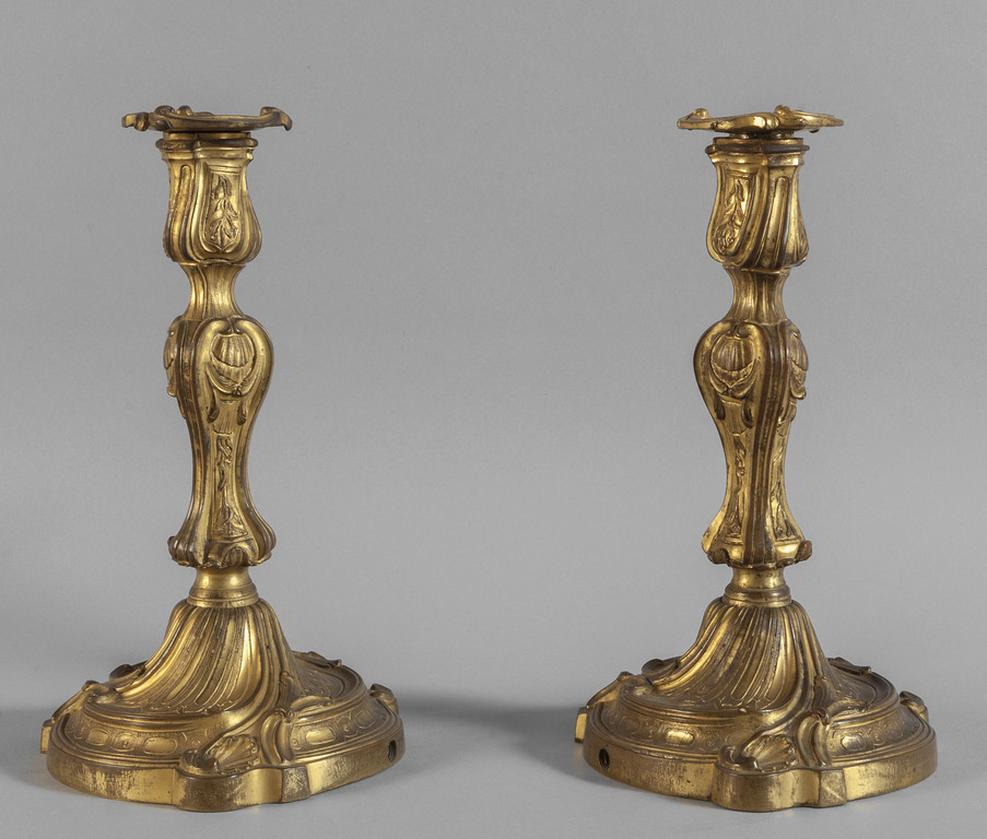 Coppia di candelieri Luigi XV in bronzo dorato Francia metà sec.XVIII
