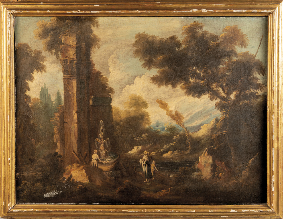 Scuola veneta sec.XVIII 'Paesaggio con personaggi e fontana' olio