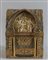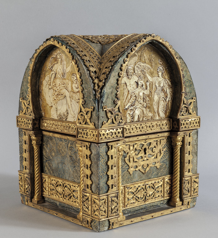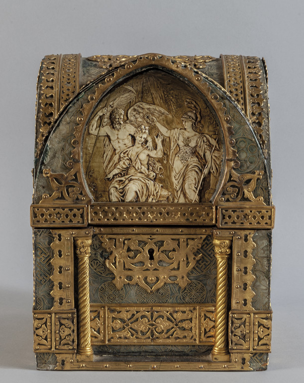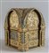 Cofanetto in legno smaltato in policromia con ricca decorazione in metallo dorato con colonne e placche riportate sui quattro lati sec.XIX vecchia etichetta Ditta Guglialmetti Milano