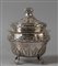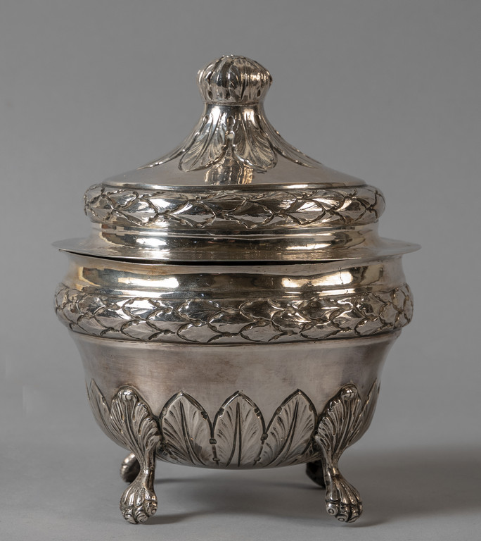 Grande e rara zuccheriera in argento finemente sbalzato a motivi classici sorretta da quattro piedini a zampa di animale Genova Punzone della Torretta II metà sec.XVIII