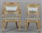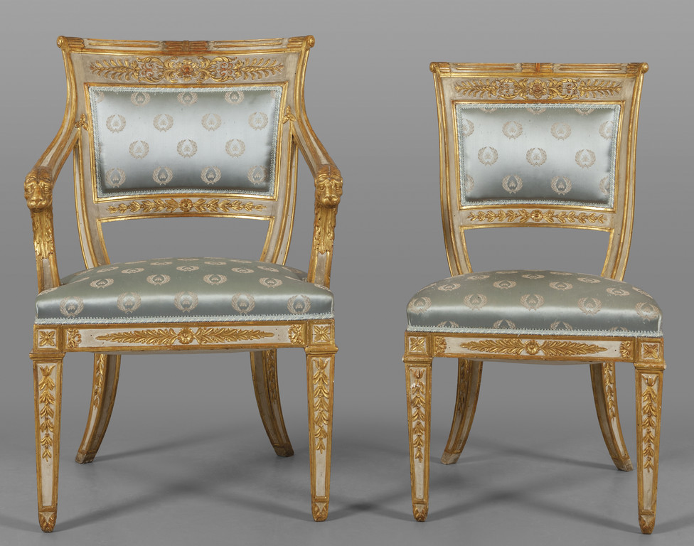 Poltrona con braccioli in legno intagliato dorato e laccato schienale a scudo terminanti con teste di leoni inizi sec. XIX e sedia analoga