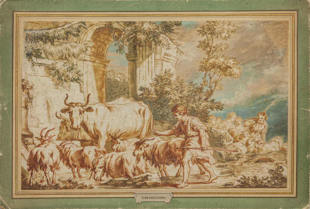 Scuola genovese sec.XVII 'Pastori con armenti' disegno policromo