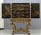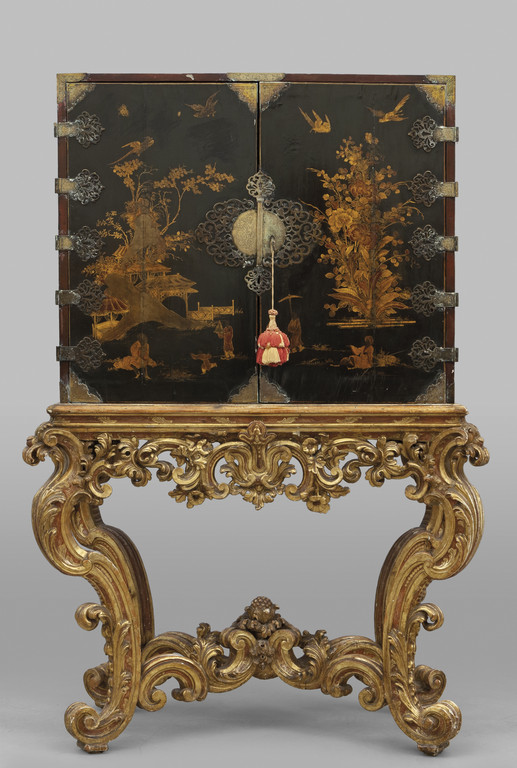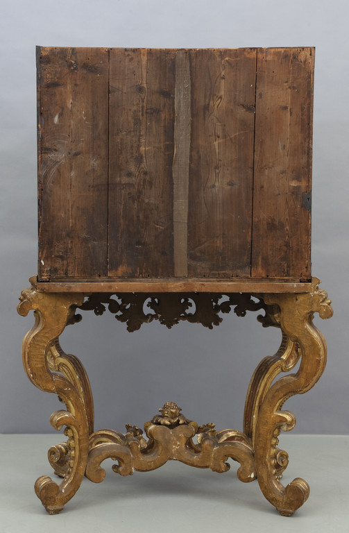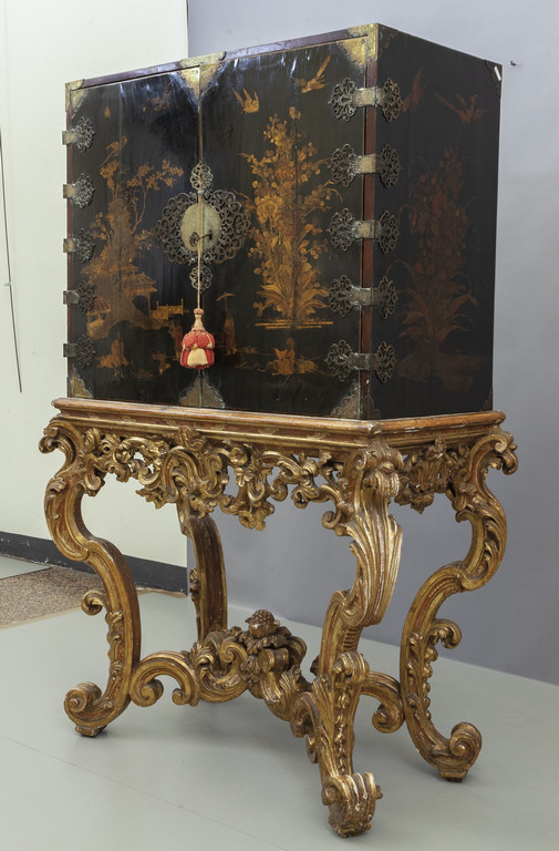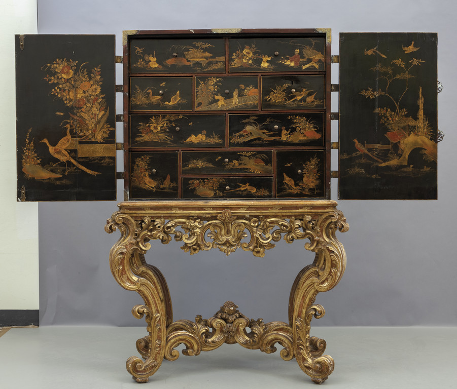 Cabinet in lacca di Cina nera con decorazioni in oro all'interno numerosi cassetti poggiante su console in legno finemente intagliato e dorato sec.XVIII/XIX