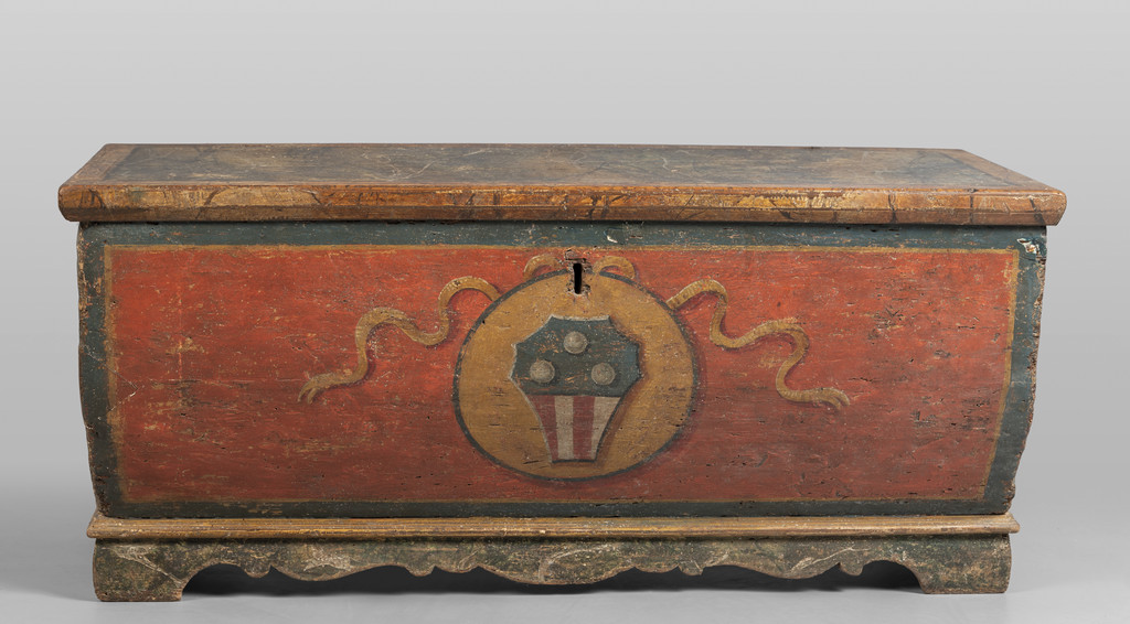 Cassapanca in legno laccato in policromia con stemma centrale Toscana inizi sec.XVIII