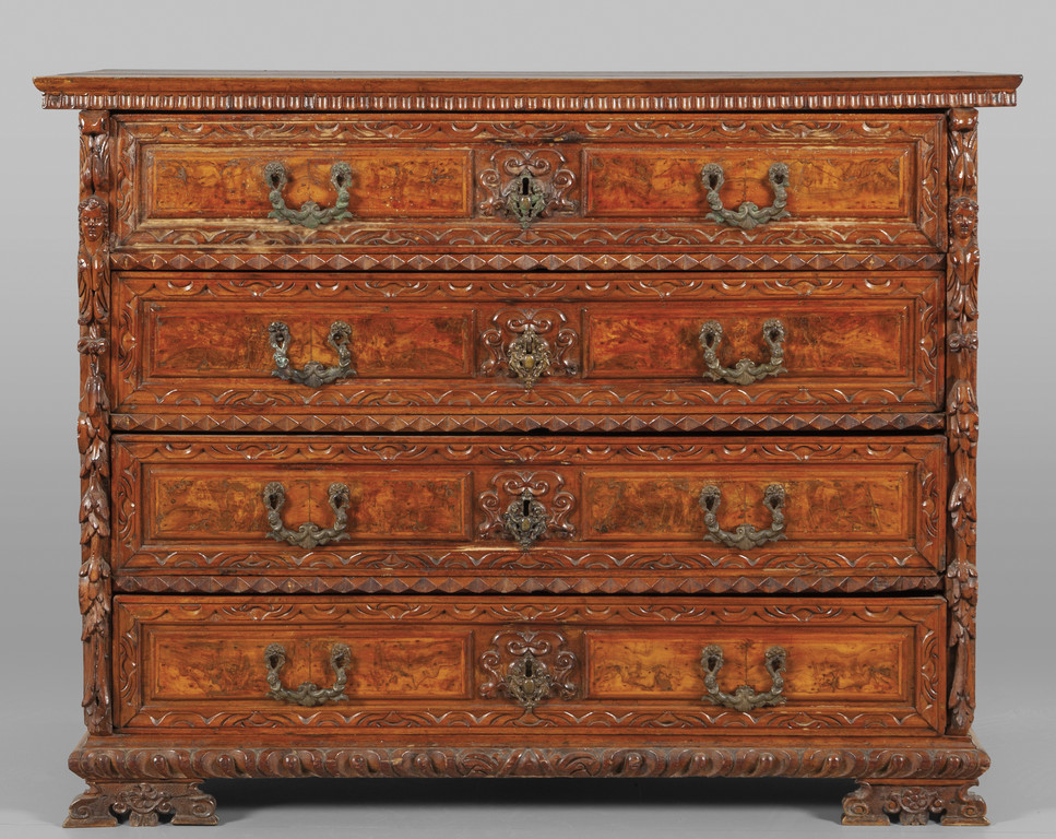 Canterano in noce a quattro cassetti finemente intagliato montanti a bambocci bronzi d'epoca Bergamo fine sec.XVII