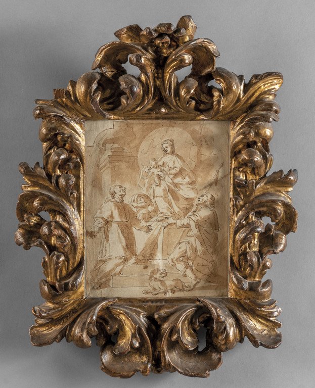 Scuola lombarda sec.XVII 'Madonna con Bambino tra Santi' disegno bella cornice a volute in legno intagliato e dorato