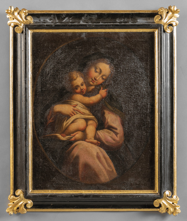 Scuola italiana sec.XVII 'Madonna con Bambino' olio cornice coeva in legno dorato ed ebanizzato