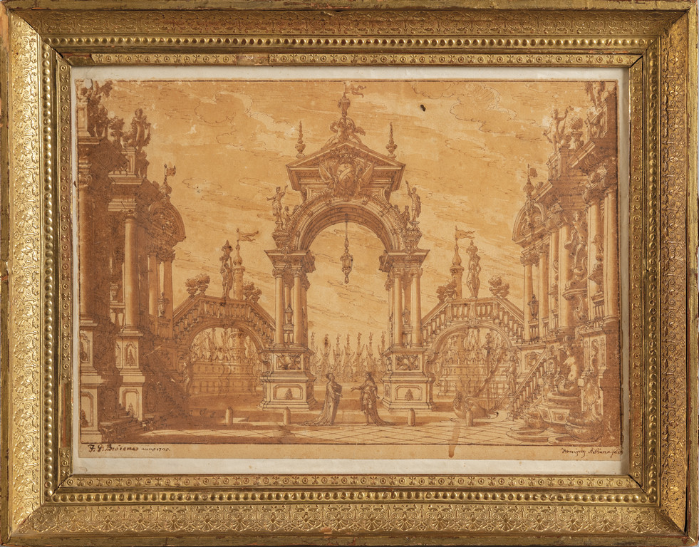 'Prospetto architettonico di città di mare con figure' sanguigna su carta f.ta in b. a s. e d.ta 1720