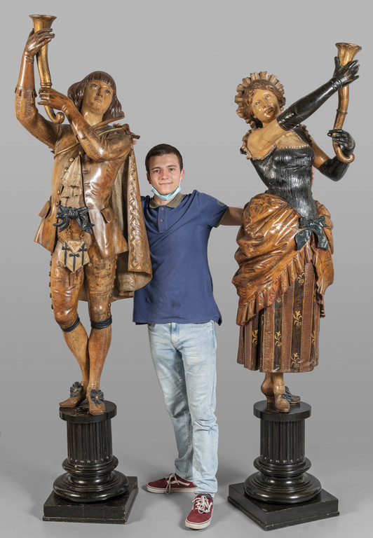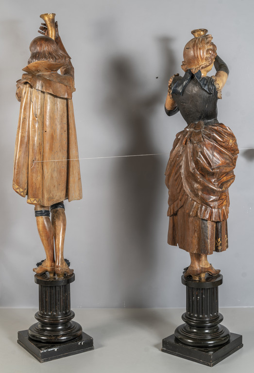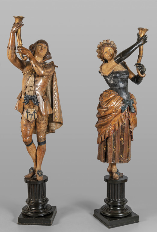 Gentiluomo e gentildonna due figure reggi torciera in legno intagliato laccato e dorato