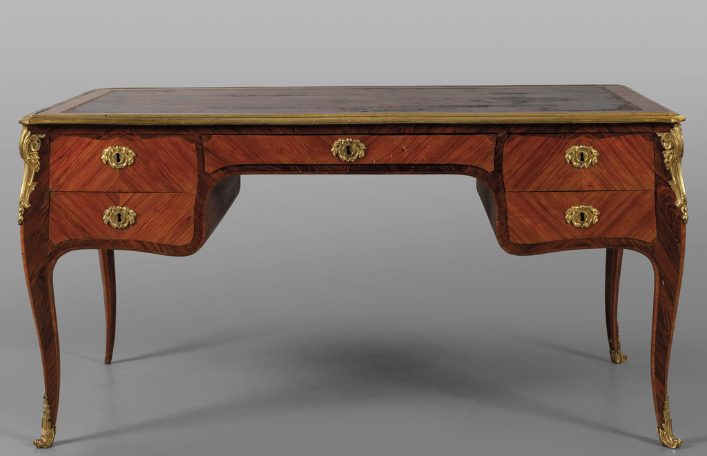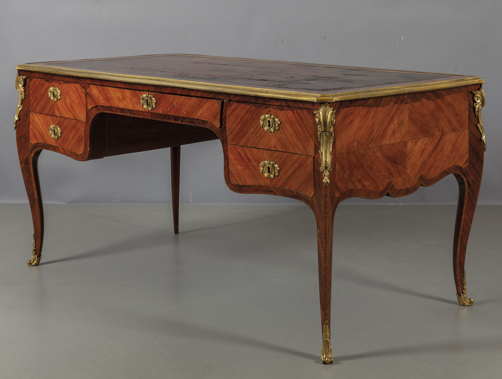 Scrivania in stile Luigi XV a cinque cassetti nella fascia lastronata in legno di viola e palissandro Francia fine sec.XVIII/inizi sec.XIX