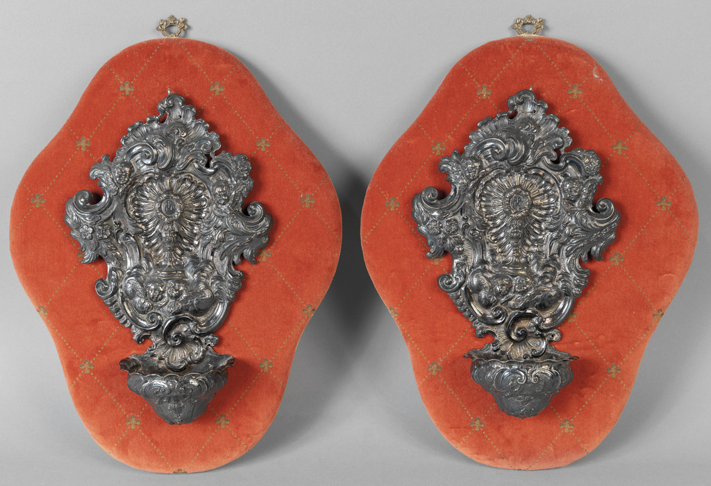 Coppia di acquasantiere in argento sbalzato Roma sec.XVIII