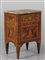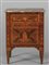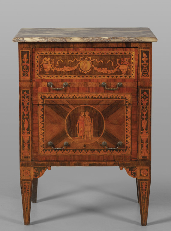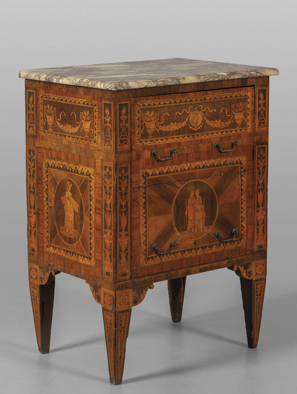 Comodino Luigi XVI a due cassetti finemente lastronato ed intarsiato in palissandro e legni vari a motivi neoclassici piano in marmo Lombardia sec.XVIII