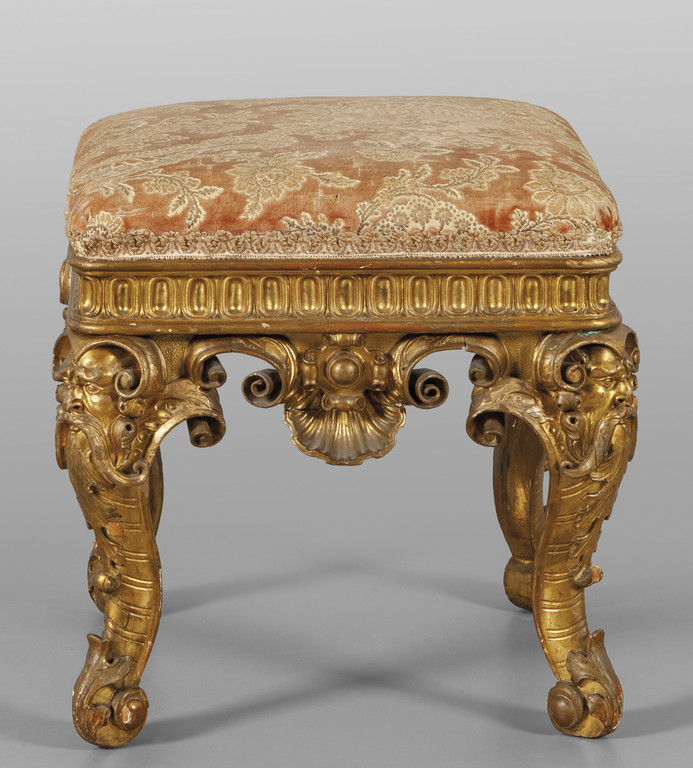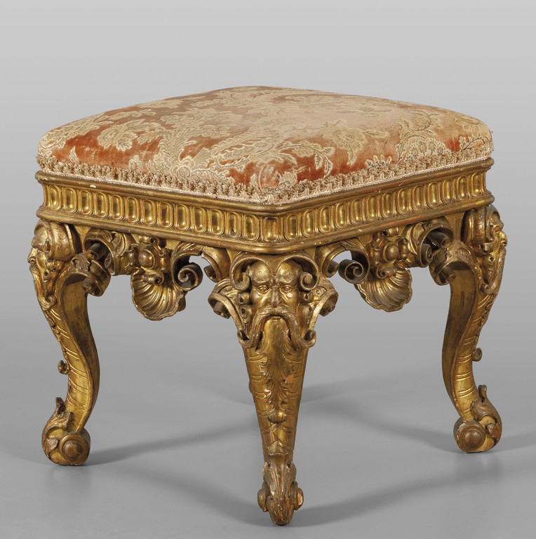 Grande sgabello in legno finemente intagliato e dorato gambe con mascheroni Torino (Pelagio Pelagi) sec.XIX