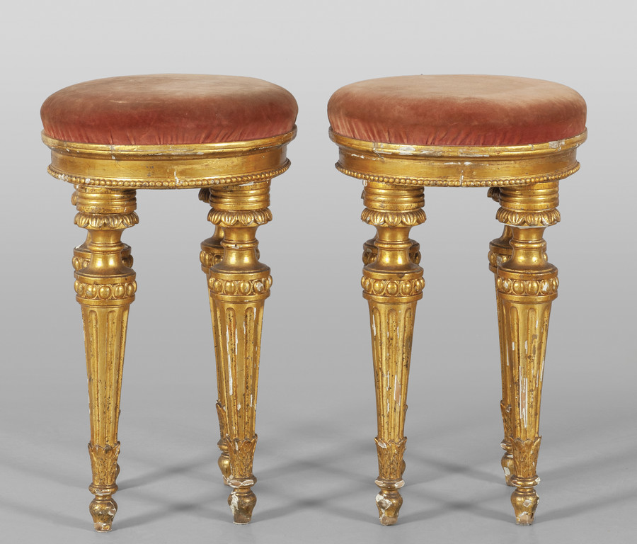 Coppia di rari sgabelli di forma circolare Luigi XVI in legno intagliato e dorato a quattro gambe Napoli sec.XVIII
