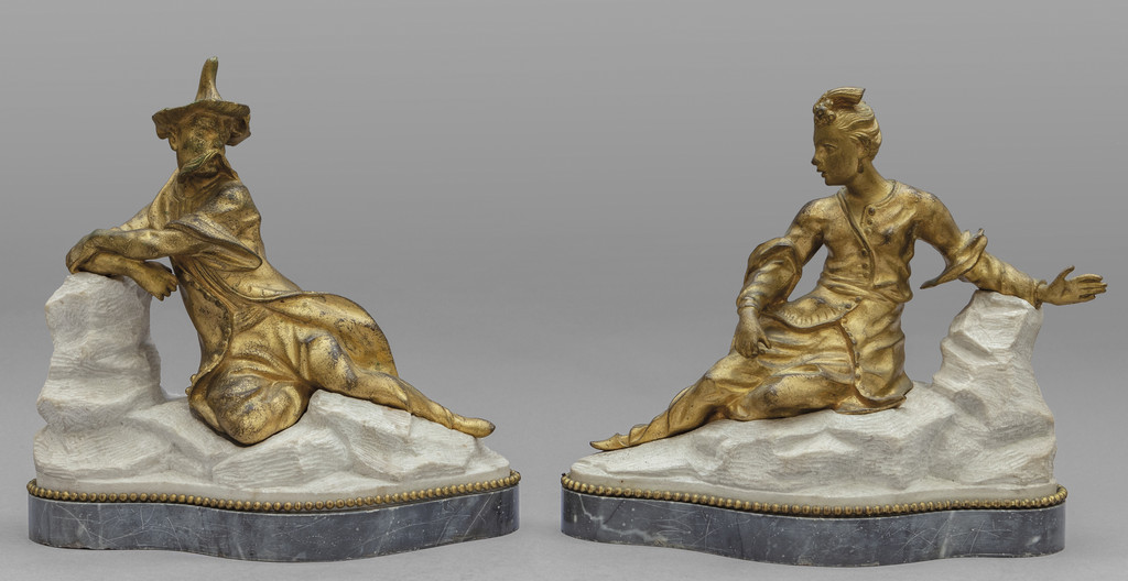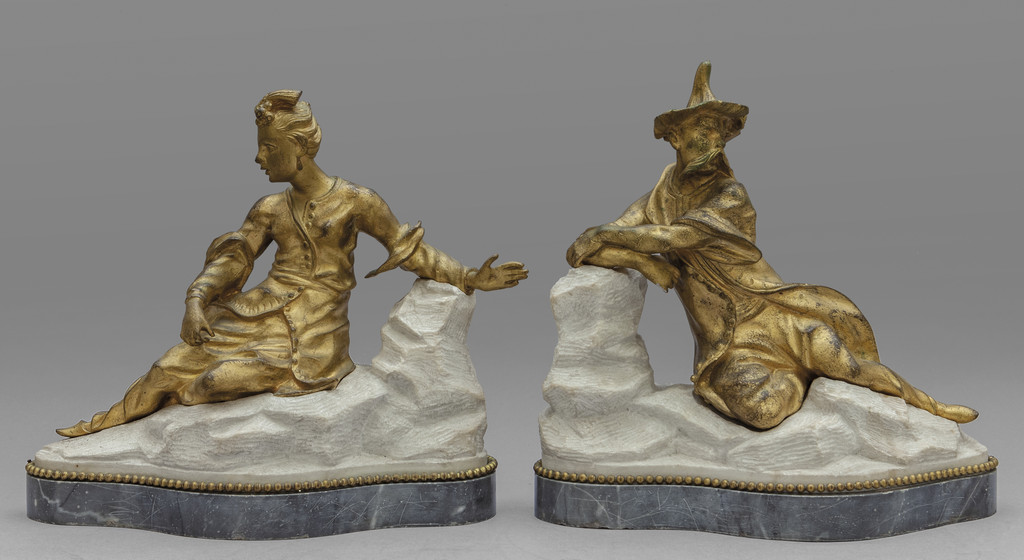 Coppia di cinesini in bronzo dorato poggianti su basi in marmo a finta roccia Francia sec.XIX