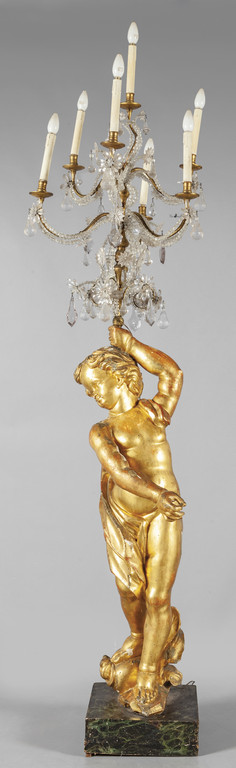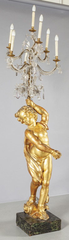 Grande putto portaluce in legno finemente intagliato e dorato con braccio a sette luci ricca decorazione in cristalli su base in legno marmorizzato Genova sec.XVIII