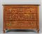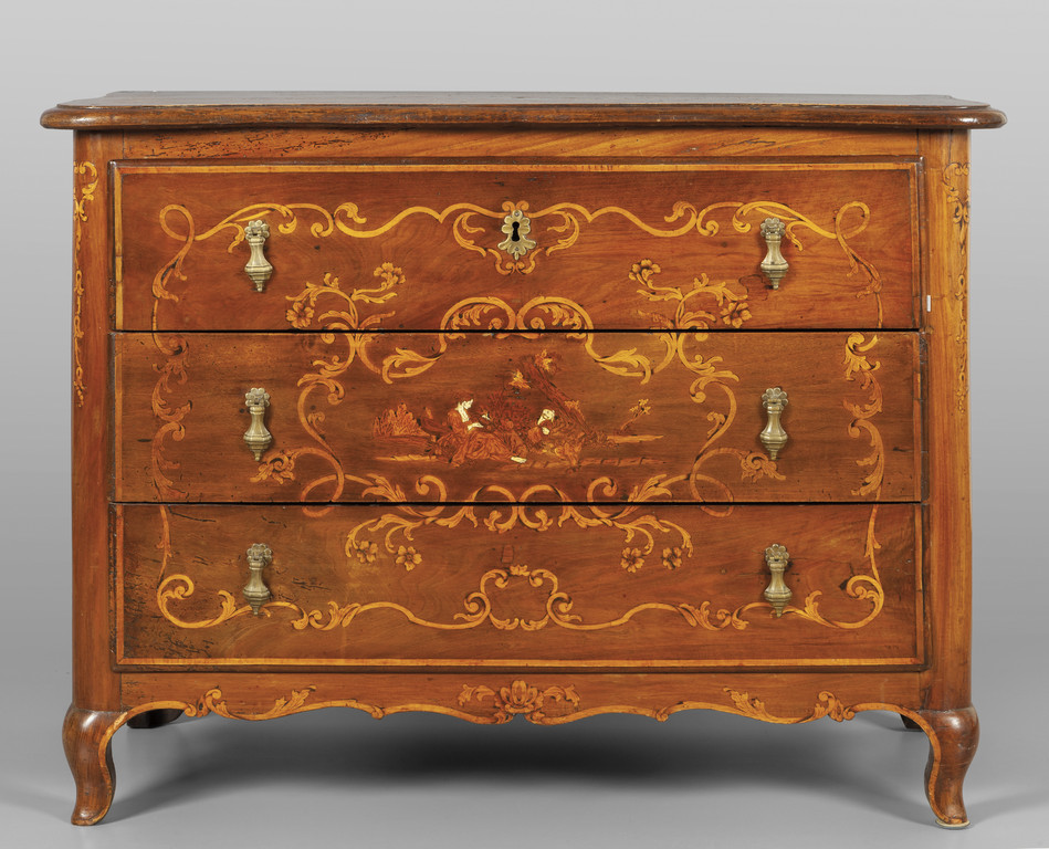 Comò Luigi XIV in noce finemente intarsiato in acero con fiori e ghirlande scene centrali intarsiate con figurine in legni vari ed avorio Piemonte I metà sec.XVIII