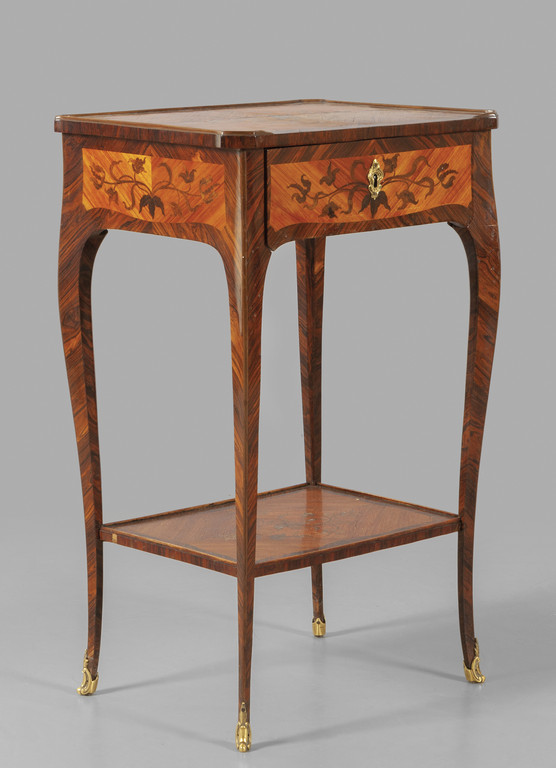 Tavolino da centro Luigi XV lastronata in bois de rose e viola marquetterie a fiori cassettino nella fascia e pianetto sottostante Francia sec.XVIII