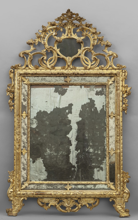 Grande specchiera Luigi XIV in legno intagliato e dorato cornice con controspecchi Piemonte sec.XVIII (luce centrale molto rovinata)