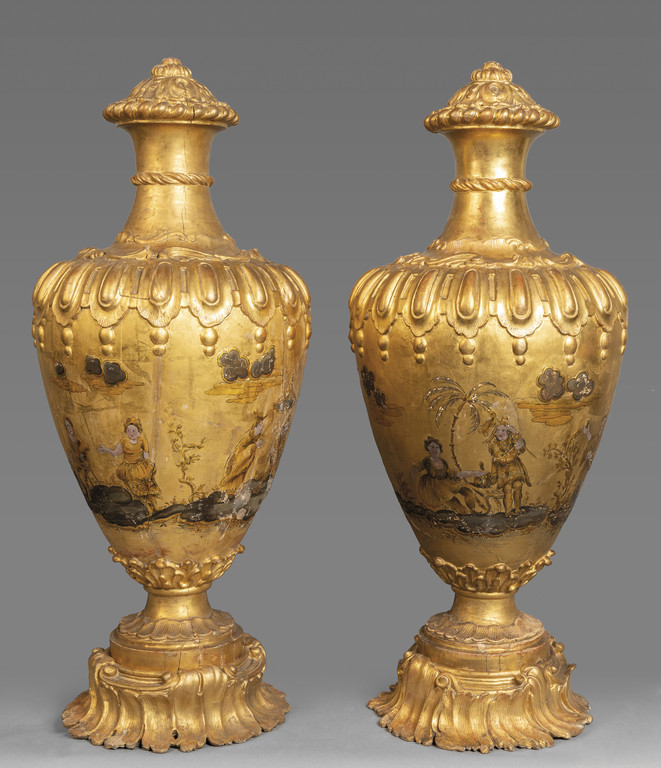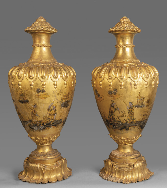 Coppia di grandi vasi in legno dorato con paesaggi con figure cinesi in rilievo Venezia sec.XVIII