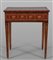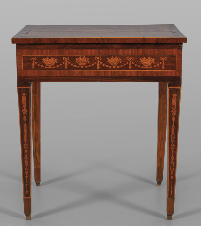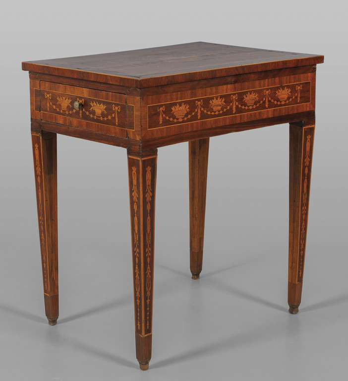 Tavolino Luigi XVI da centro lastronato ed intarsiato in noce e legni di frutto a motivi floreali con medaglione centrale due cassetti nelle fasce laterali Lombardia fine sec.XVIII inizi sec.XIX